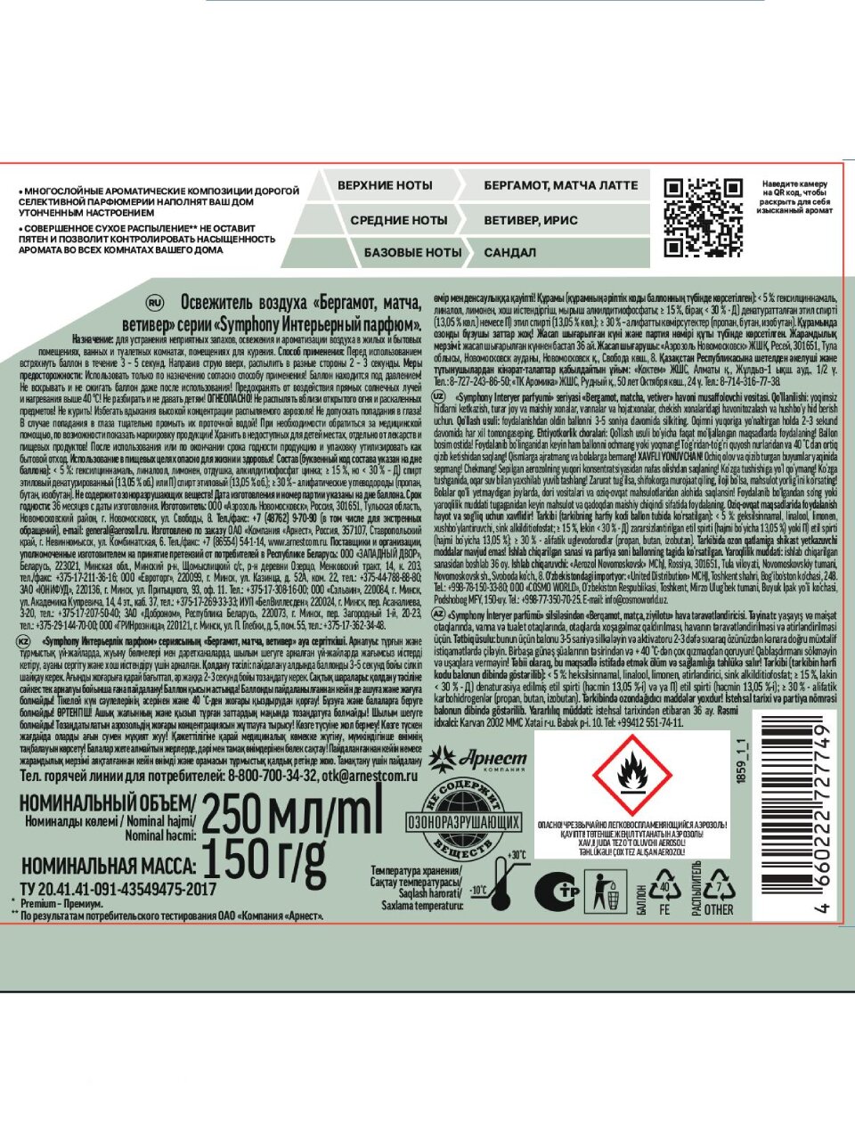 Освежитель воздуха Symphony 250 мл с нотами бергамота, матча и ветивера — быстро устраняет запахи, наполняет дом свежестью и создает атмосферу уюта для всей семьи.
