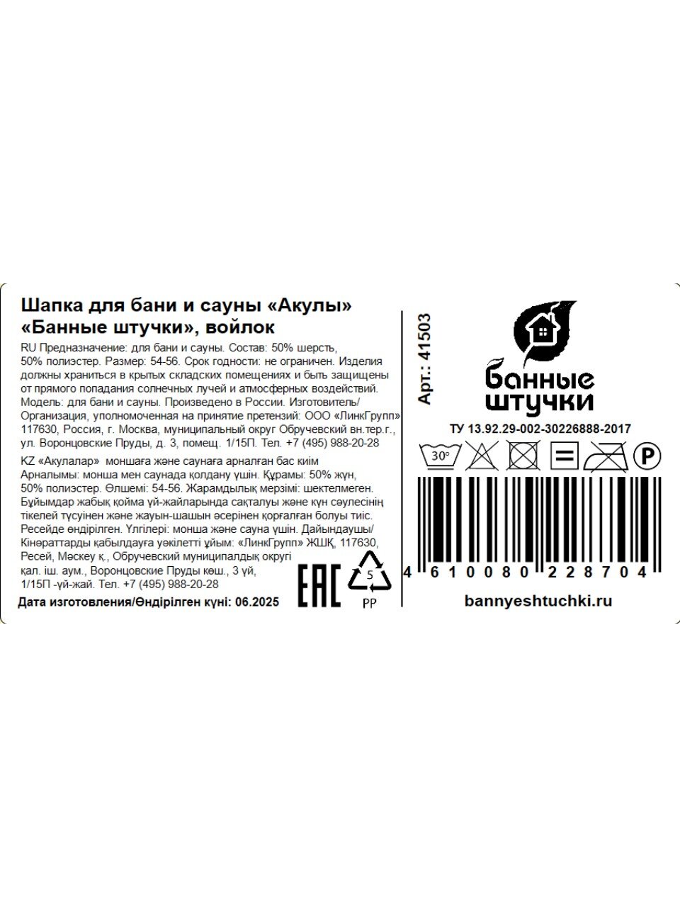 Шапка для бани «Банные штучки, Акулы» сочетает в себе современные тренды и проверенные материалы. Благодаря комбинации шерсти и полиэстера, изделие эффективно защищает голову от перегрева и сохраняет комфорт даже при длительном посещении парной. Такой состав облегчает стирку и ускоряет высыхание, что важно для регулярного использования. Если вы ищете, какую шапку для бани купить недорого для дачи или сауны, обратите внимание на этот вариант.