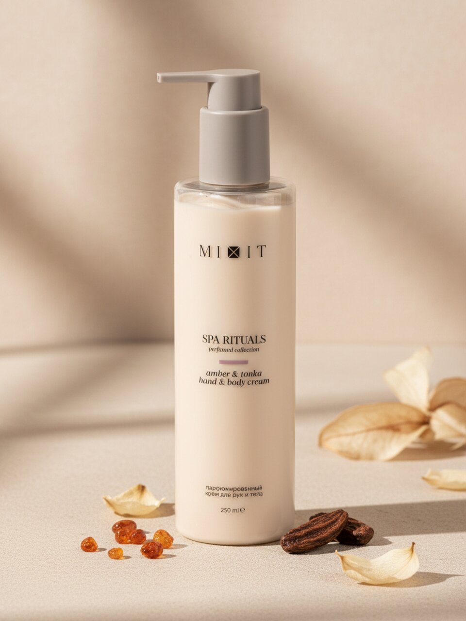 Крем для рук и тела Mixit Spa Rituals 250 мл: глубокое увлажнение, шелковистая кожа и утончённый аромат амбры и бобов тонка для ежедневного ухода.