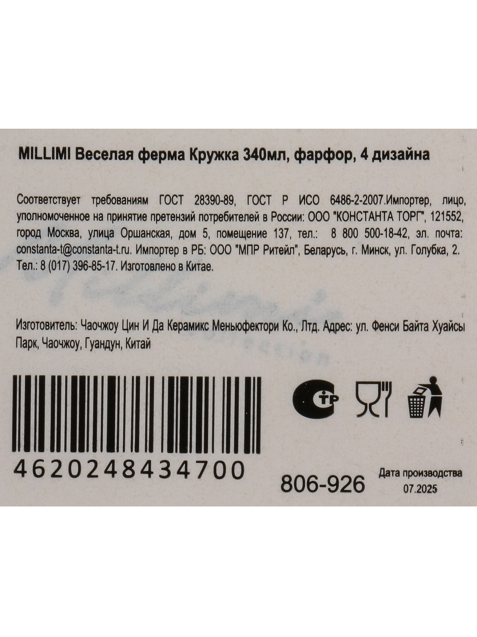 Кружка фарфор 340 мл Millimi «Веселая ферма»: яркий дизайн, подходит для СВЧ и посудомоечной машины — практичный выбор для дома и дачи.