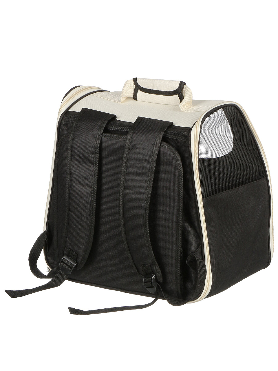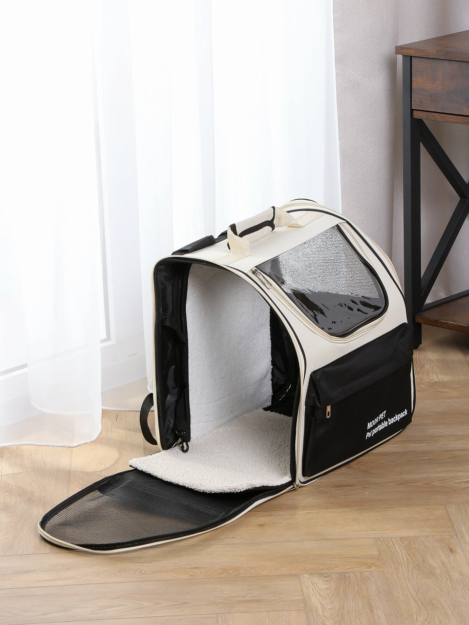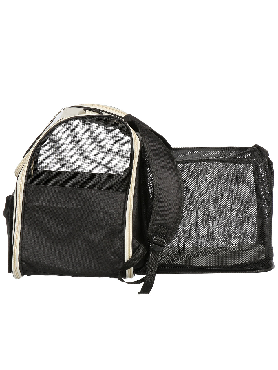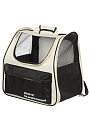 Переноска изготовлена из прочного полиэстера с сетчатыми вставками, что обеспечивает долговечность и комфорт для животного.