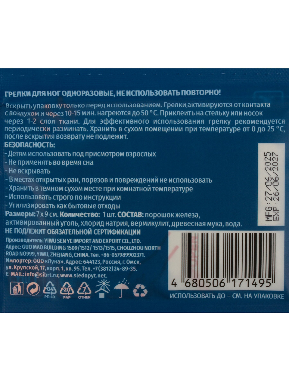 Откройте индивидуальную упаковку, активируйте грелку встряхиванием и поместите в обувь или носок. Размер 9х7 см позволяет использовать её точечно, не мешая при ходьбе.