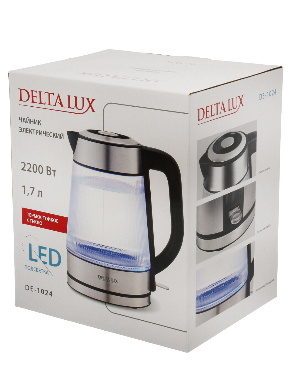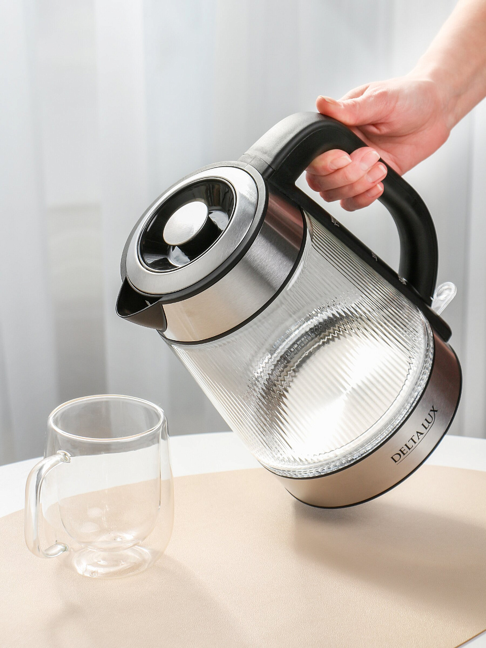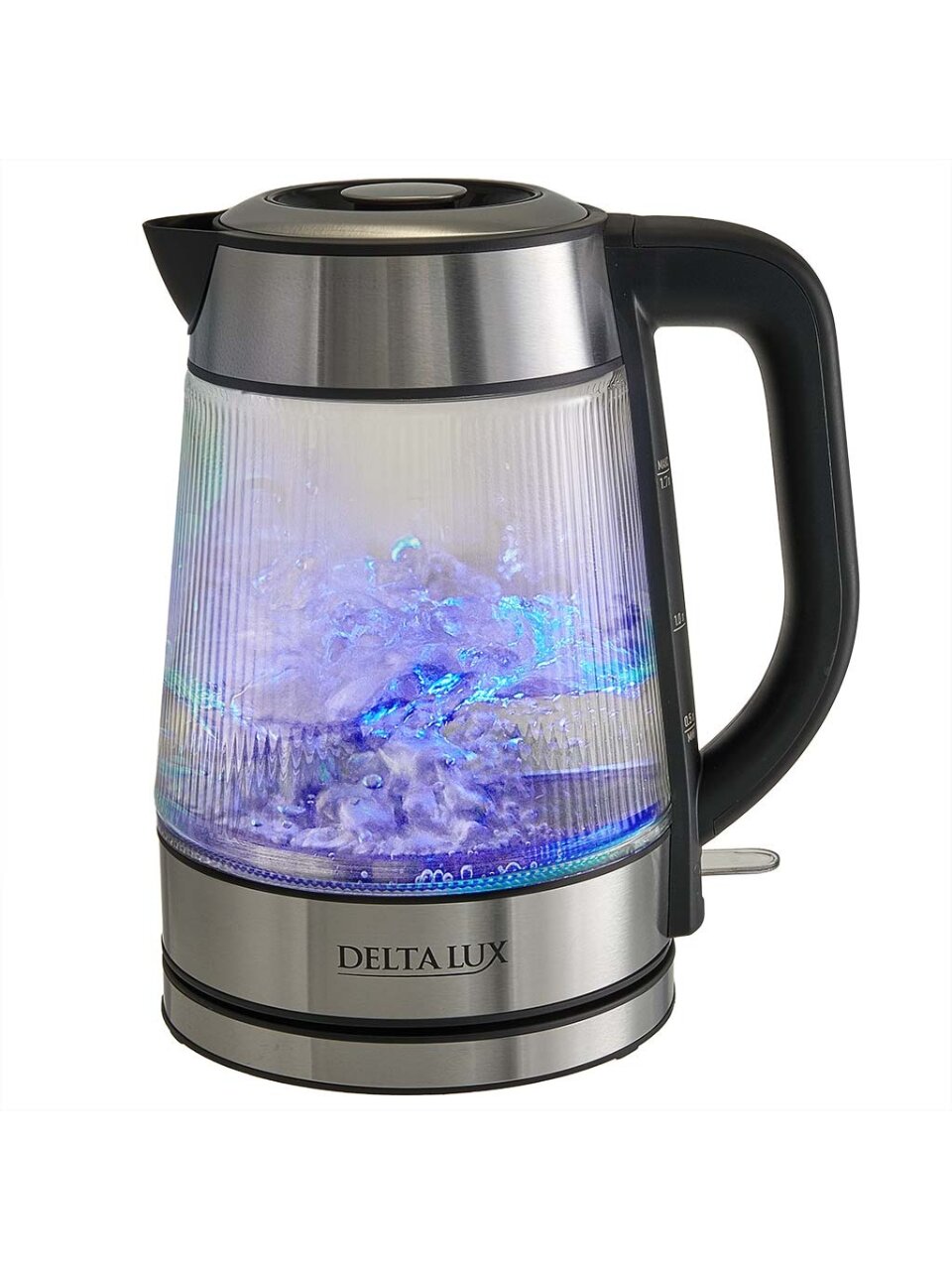 Стильный электрический чайник Delta Lux DE-1024: 1,7 л, стекло, 2200 Вт, автоотключение — быстрое и безопасное кипячение для дома и дачи.