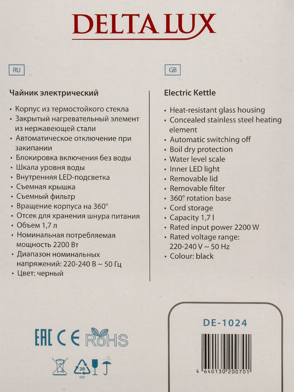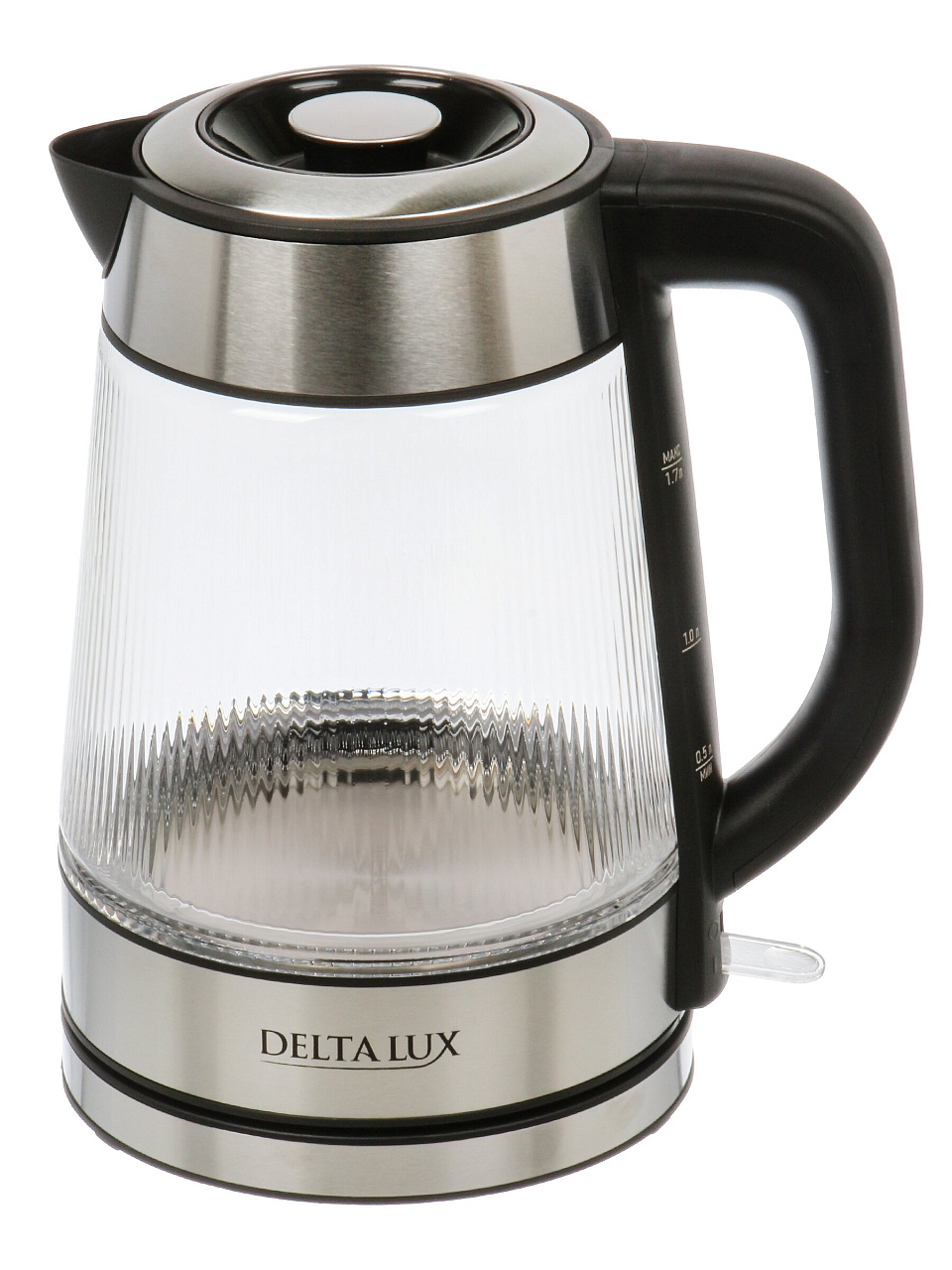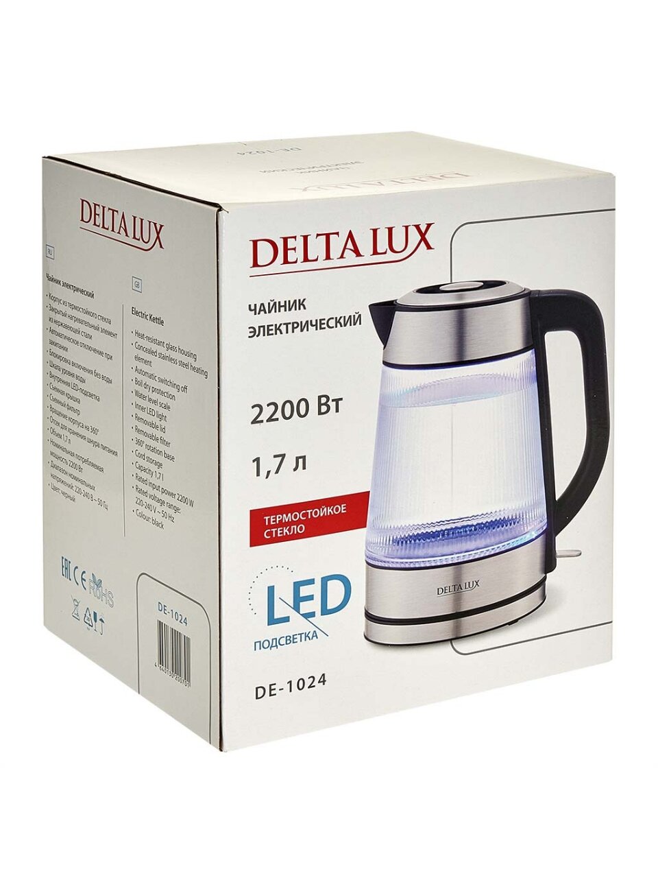 Стильный электрический чайник Delta Lux DE-1024: 1,7 л, стекло, 2200 Вт, автоотключение — быстрое и безопасное кипячение для дома и дачи.