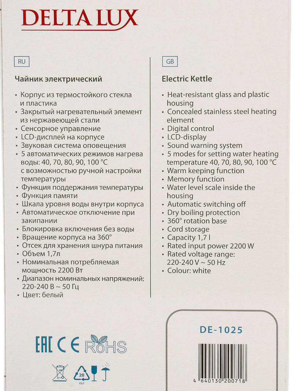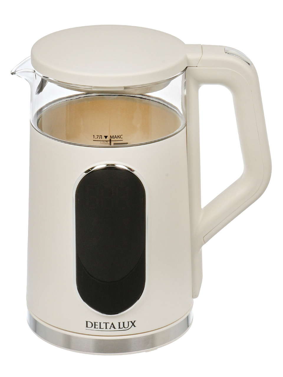 Электрический чайник Delta Lux DE-1025: быстрое кипячение 1,7 л воды за 2200 Вт, стильное стекло и пластик, автоотключение и LED-подсветка для вашего комфорта.