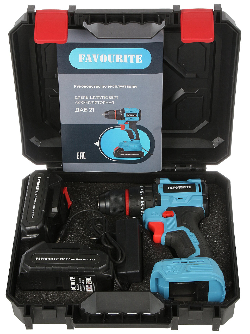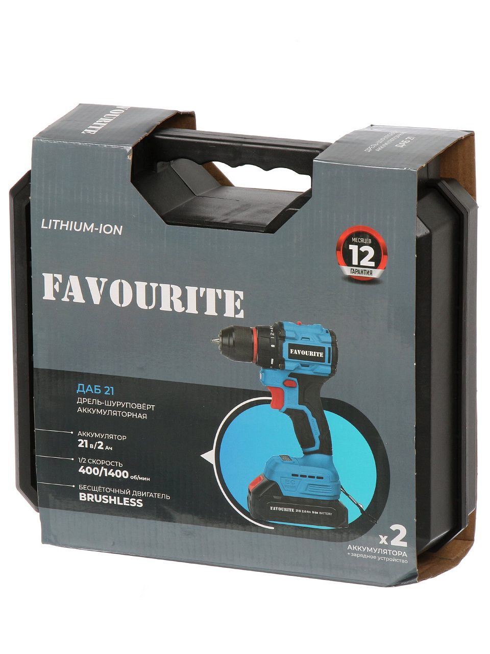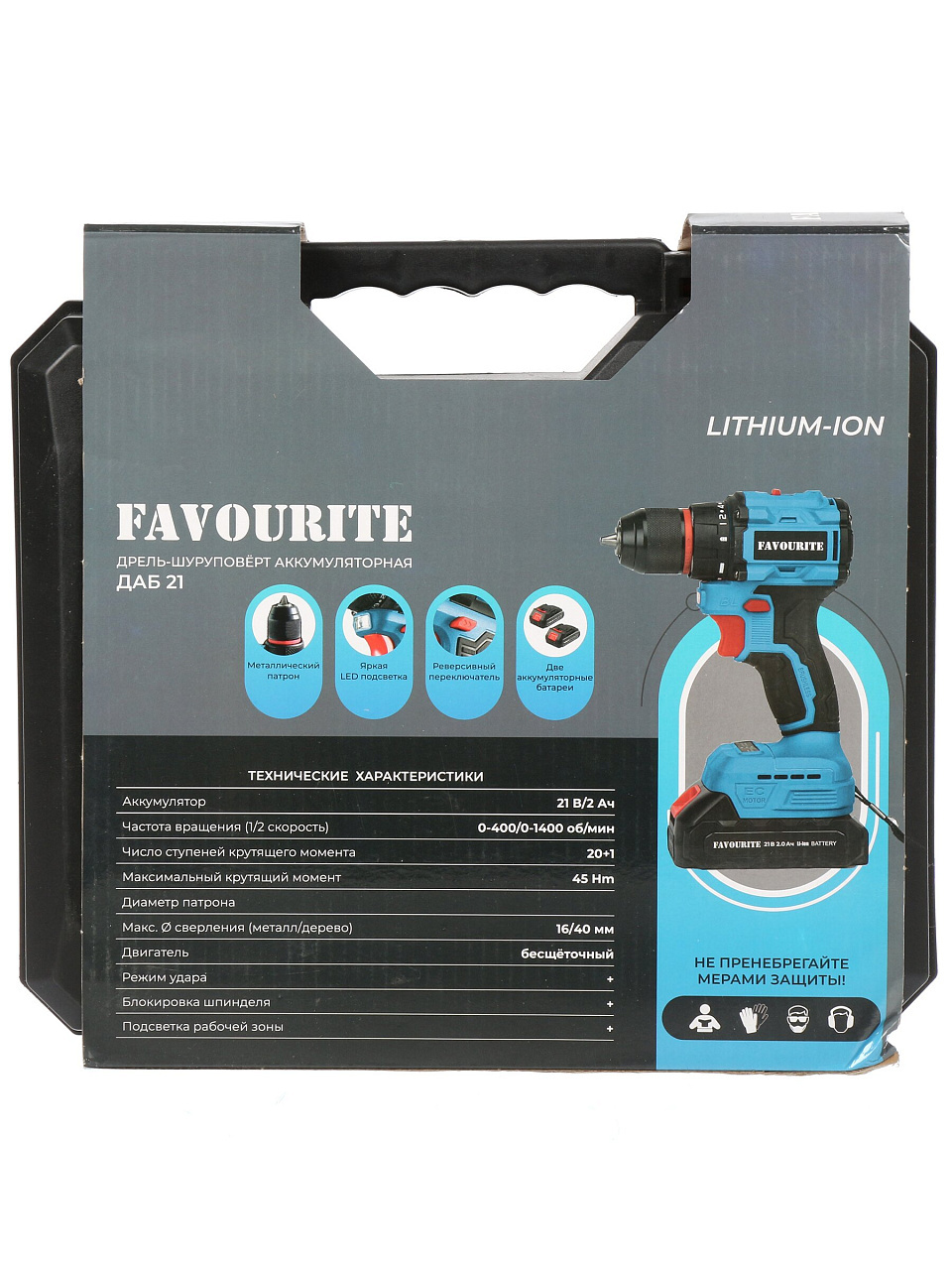 Дрель-шуруповерт Favourite ДАБ 21 — универсальный инструмент 2-в-1 с двумя Li-ion аккумуляторами 21В, кейсом и максимальным крутящим моментом 45 Н·м для дома и дачи.