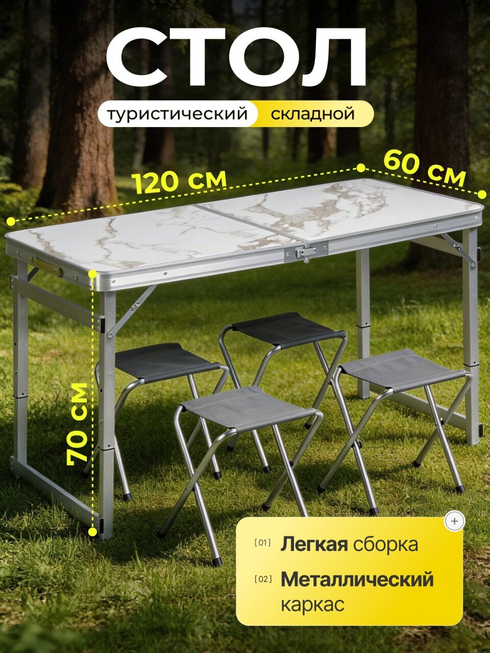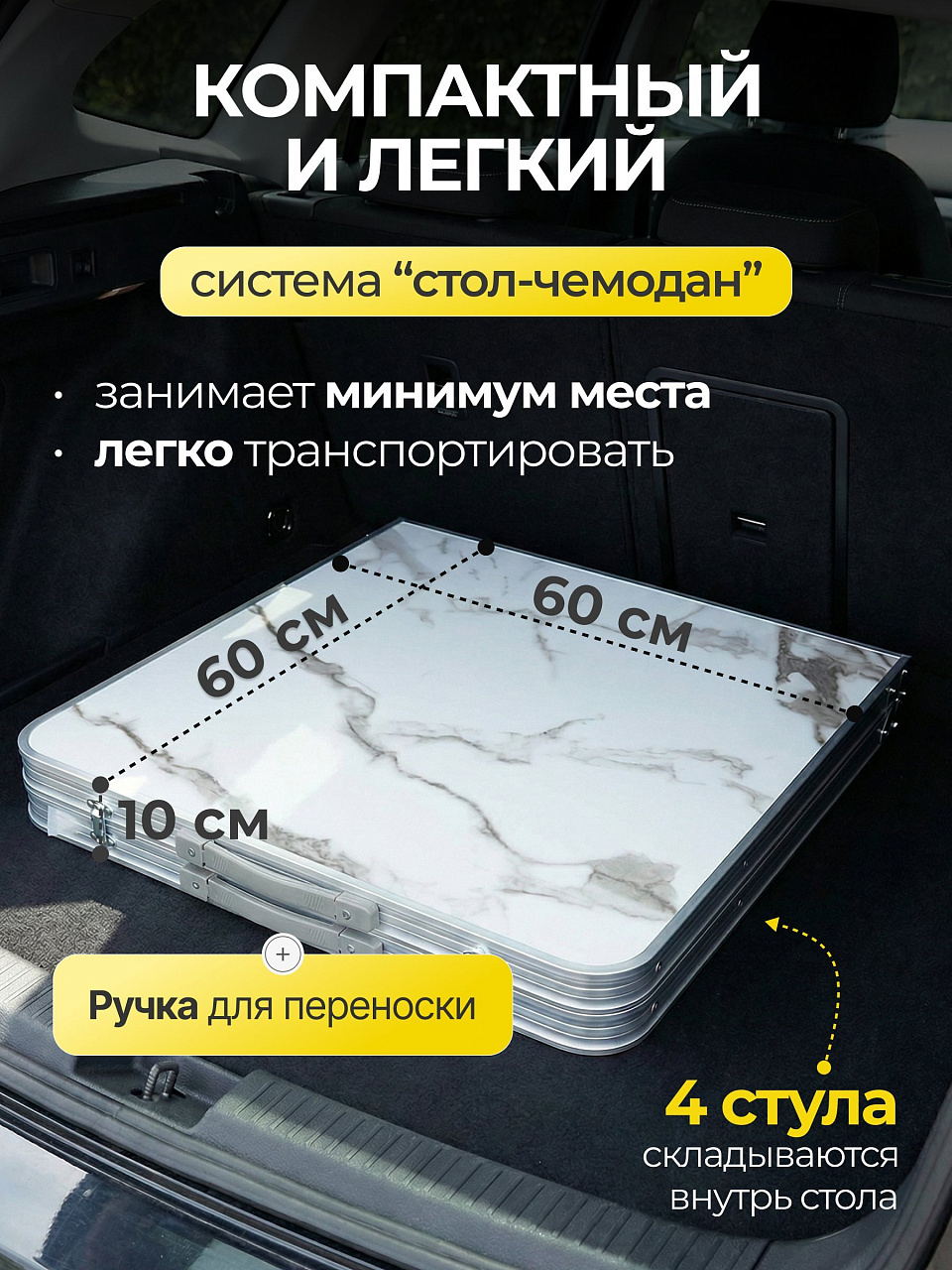 Складной стол-чемодан 120х60 см с 4 стульями: готовое решение для пикника и дачи. Прочный, компактный, стильный дизайн под мрамор.