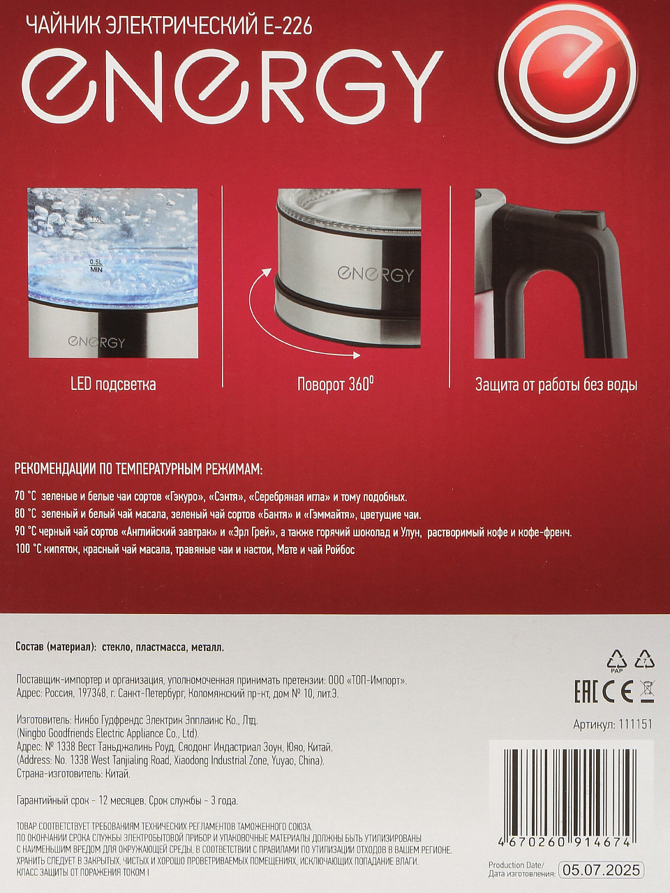 Выбирайте чайник Energy E-226 по выгодной цене — быстрое оформление заказа, гарантия от производителя и быстрая доставка. Оцените удобство и эстетику на своей кухне уже сегодня.