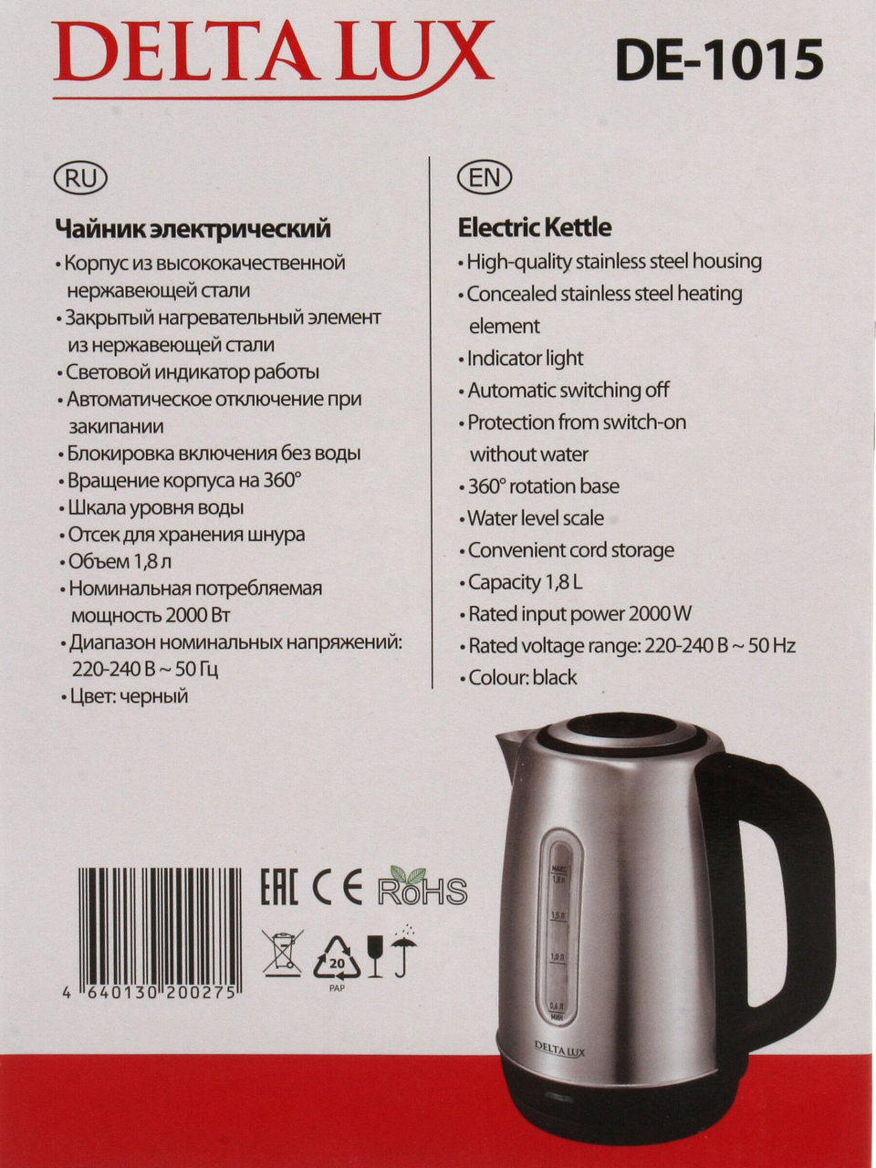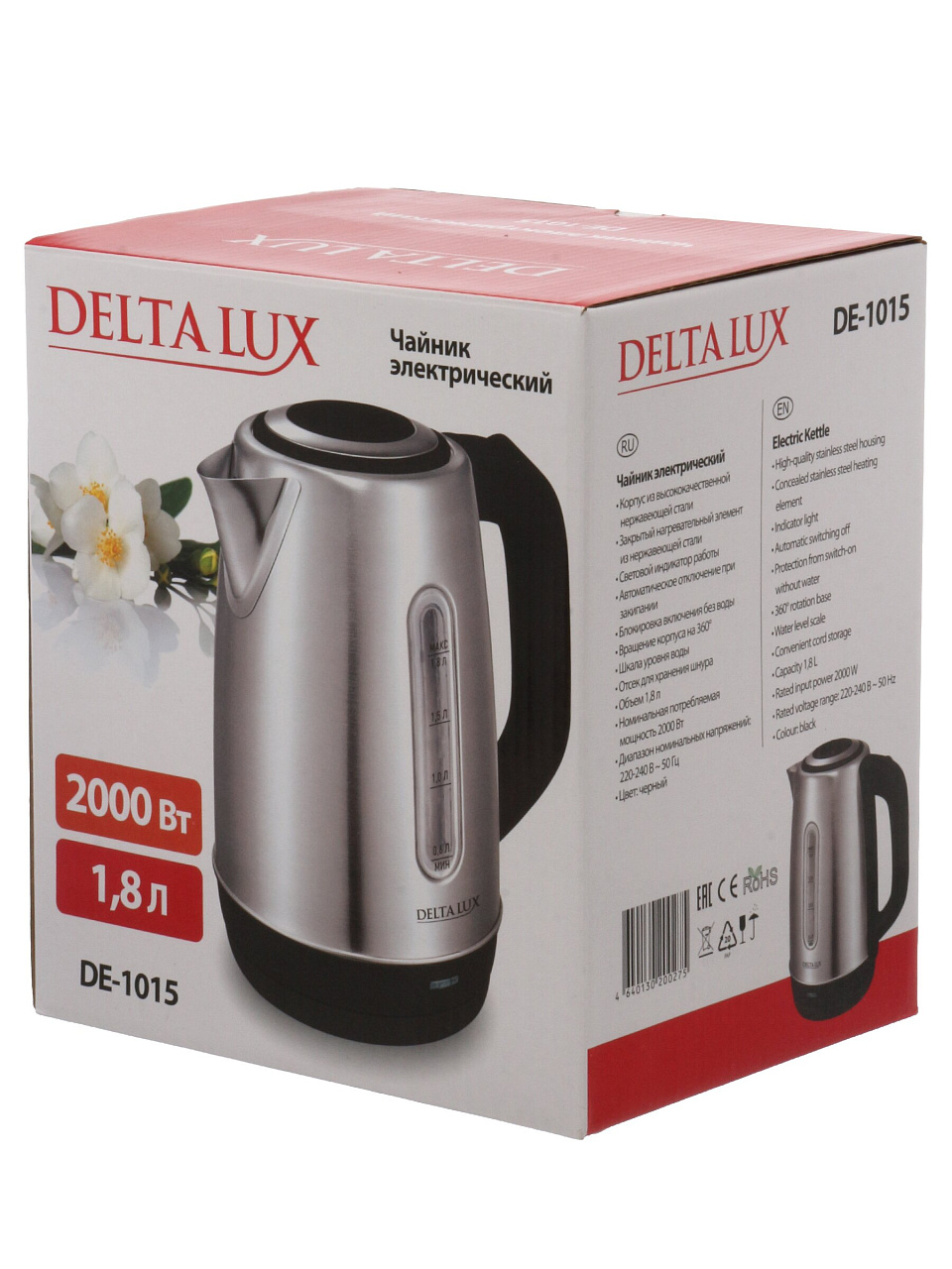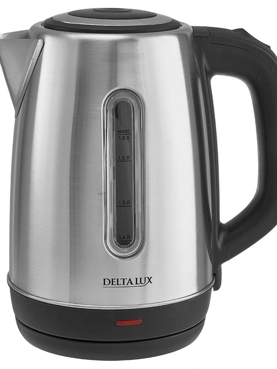Чайник электрический Delta Lux DE-1015: стильный и надежный выбор для дома и дачи — 1.8 л, 2200 Вт, нержавеющая сталь, автоматическая защита и быстрая работа.