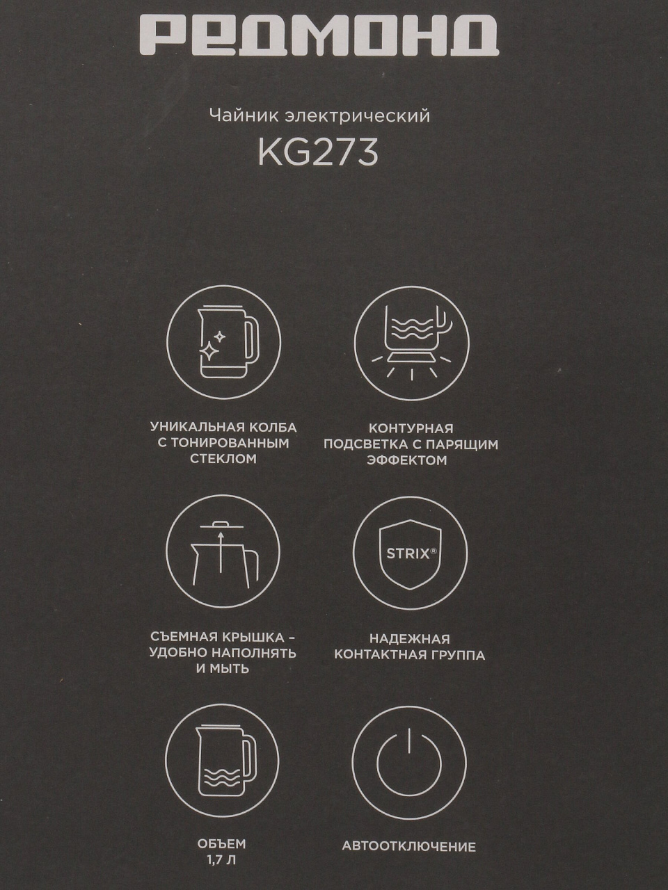 Электрический чайник Редмонд Strix KG273 — быстрое и безопасное кипячение воды: 1,7 л, стекло, 2200 Вт, долговечный нагревательный элемент, стильный дизайн для кухни.