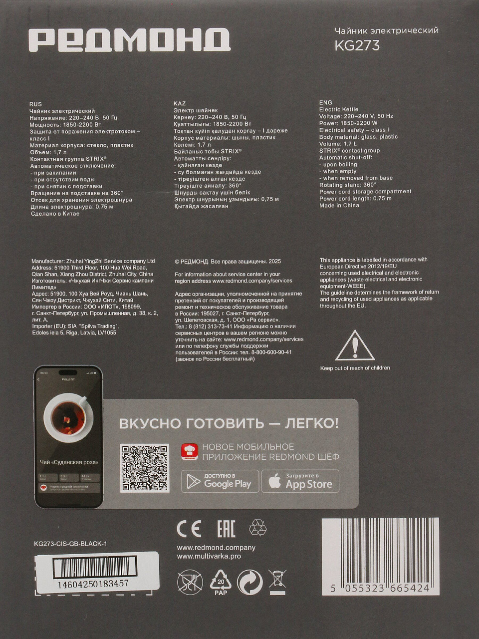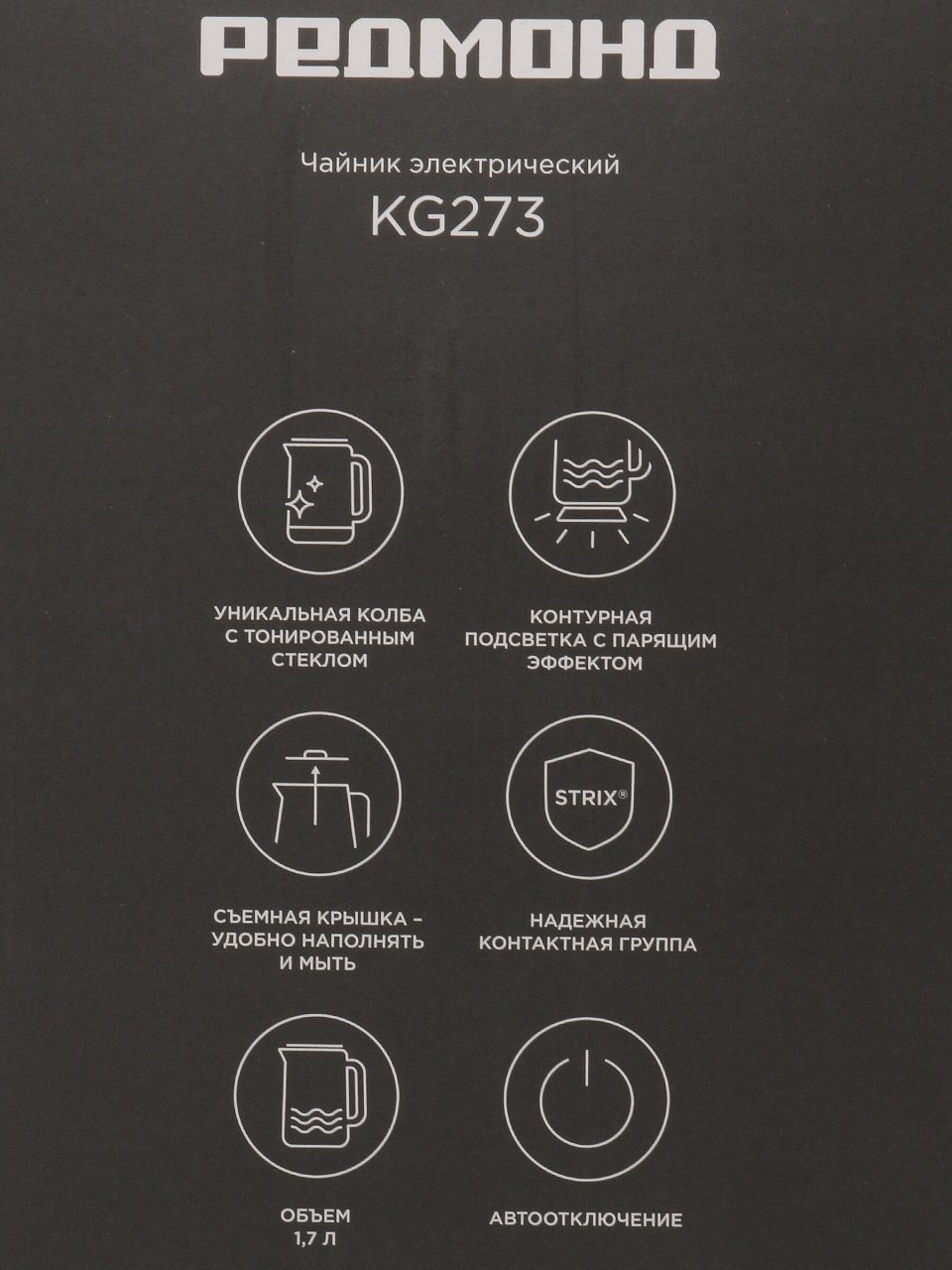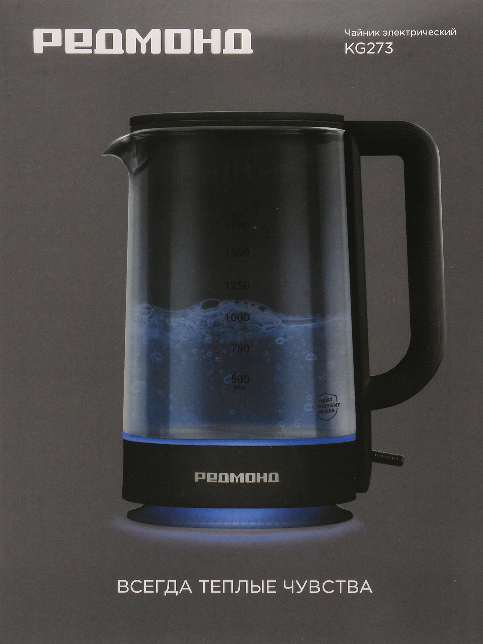 Чайник электрический Редмонд KG273: быстрое кипячение воды за 2200 Вт, стильное стекло, объем 1,7 л — идеальный выбор для дома и дачи.