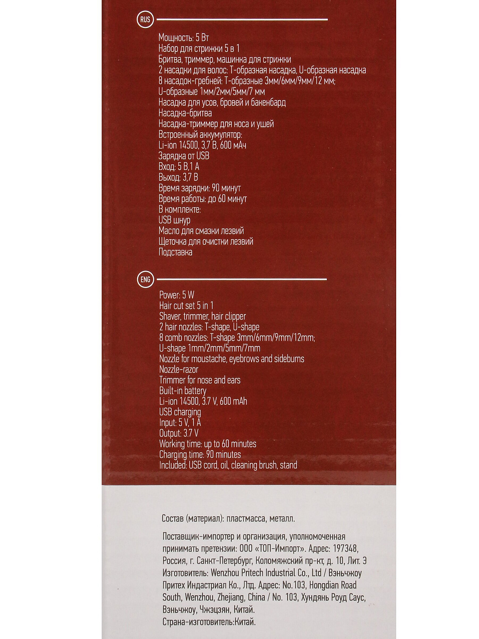 Мощность 5 Вт, автономная работа до 60 минут, компактный корпус. В комплекте: машинка для стрижки, триммер и бритва — всё необходимое для полного ухода.