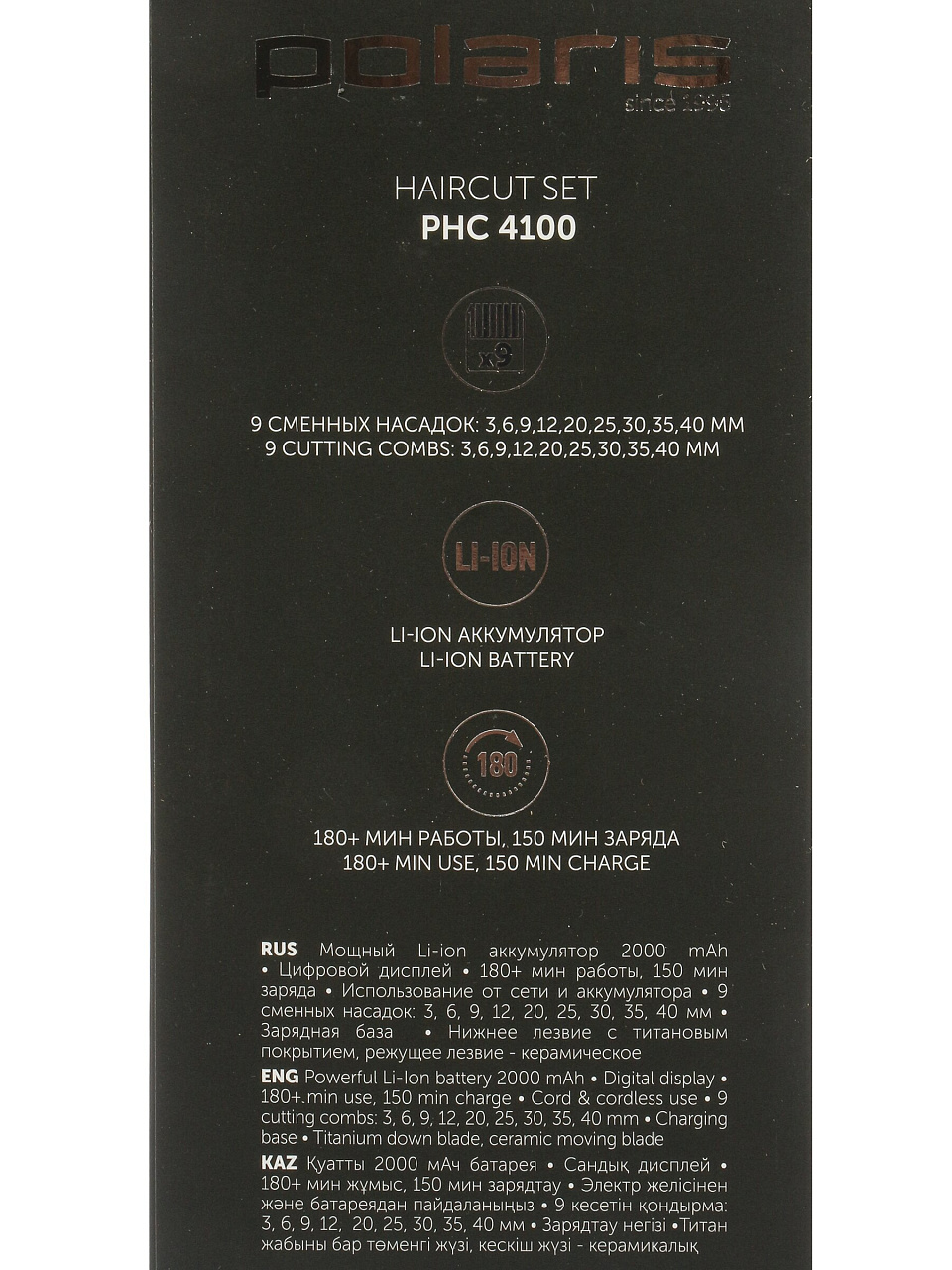 Машинка для стрижки Polaris PHC 4100: 9 насадок, аккумулятор, 3 Вт — идеальный выбор для быстрой и точной стрижки дома или на даче без лишних затрат.