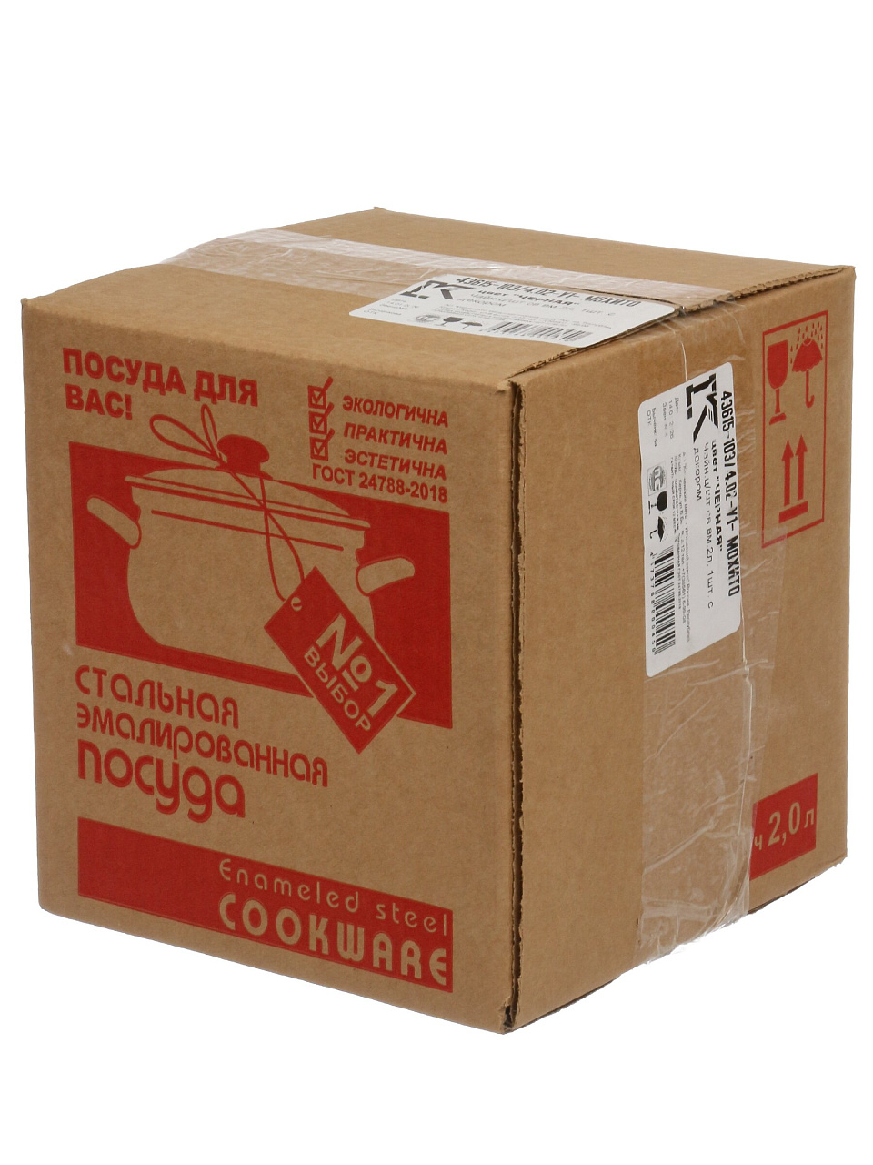Объем — 2 литра, материал корпуса — сталь с эмалированным покрытием, ручка — пластик с термоизоляцией, крышка — стекло.
