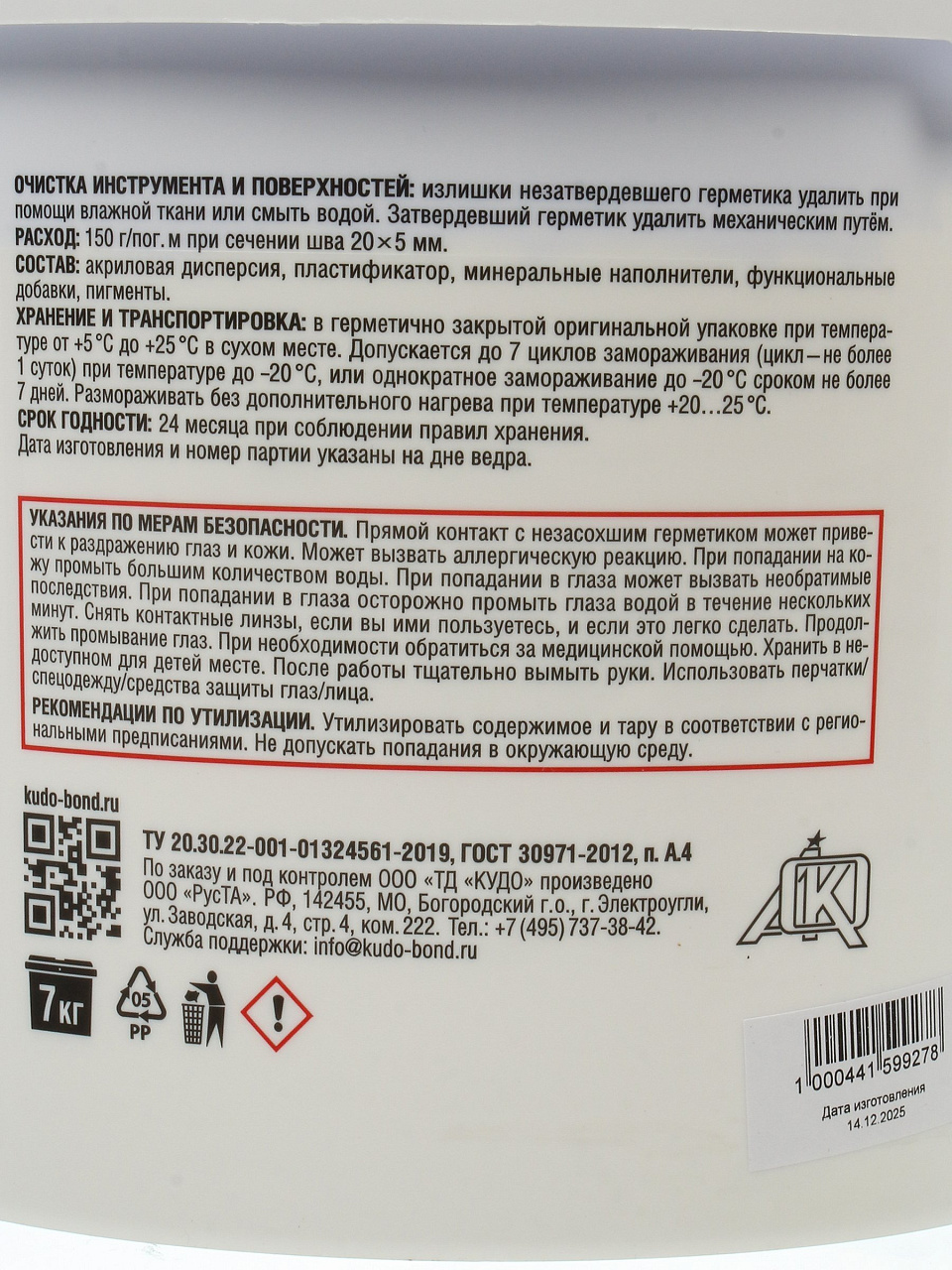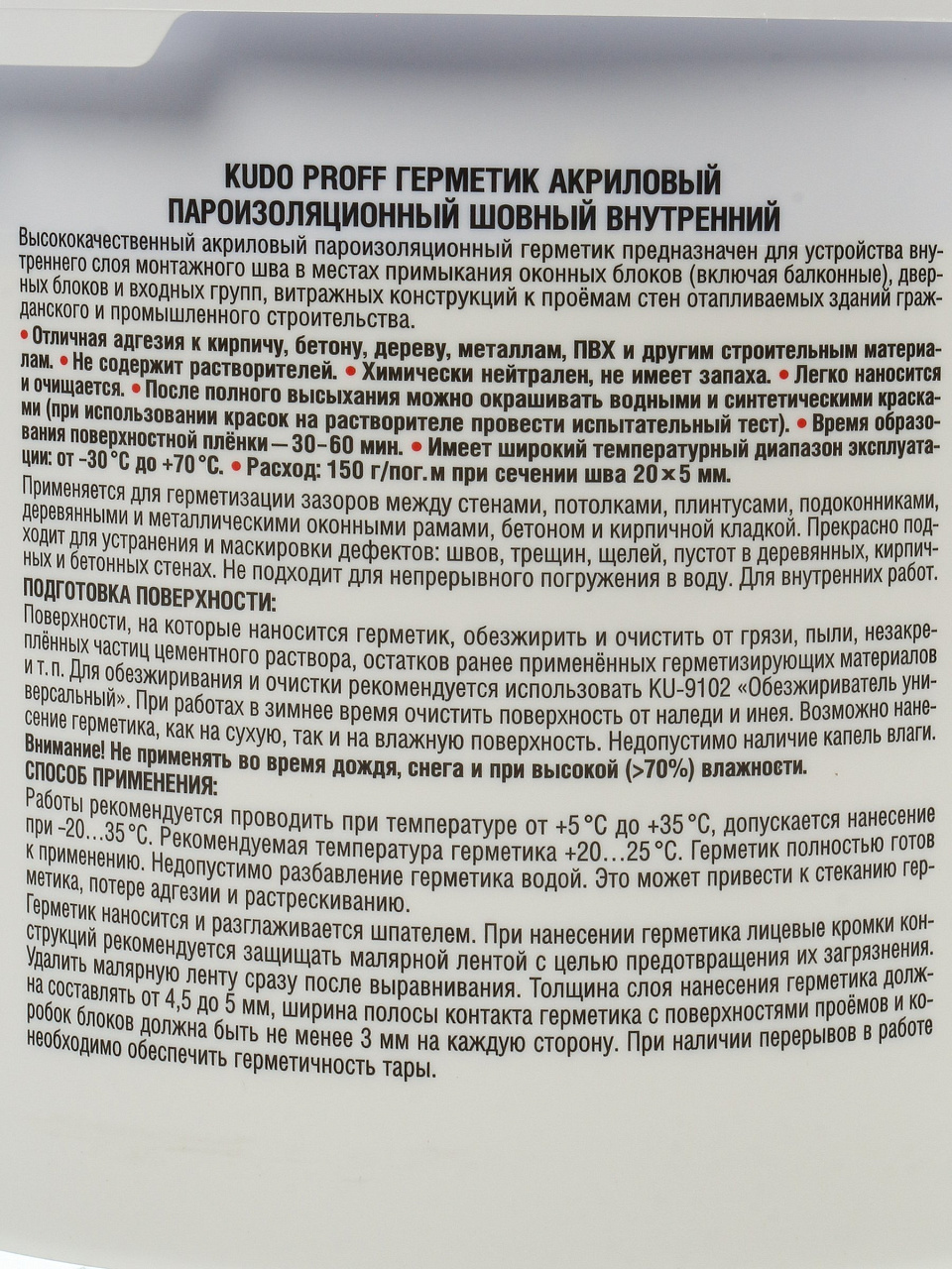 Герметик акриловый пароизоляционный KUDO Proff SMS-311, 7 кг — идеальное решение для герметизации швов внутри помещений, надёжная защита от влаги и пара.