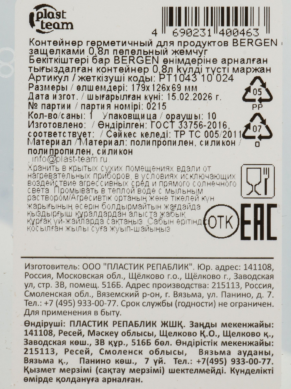 Какой материал использован в контейнере Plast Team Bergen 0.8 л?