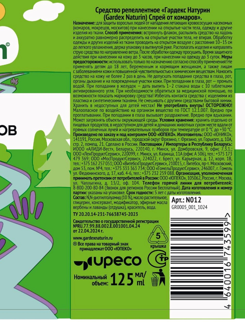 Спрей Gardex Naturin 125 мл — эффективная защита от комаров для взрослых: работает до 4 часов, удобно брать на природу, не оставляет следов на одежде.