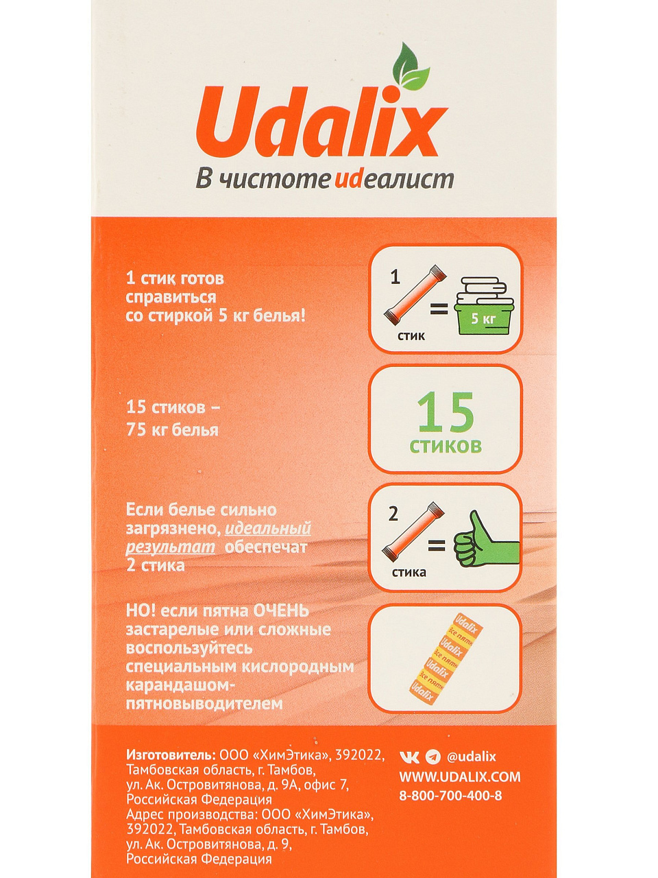 В отличие от стандартных порошков в больших упаковках, Udalix в стиках экономит место и позволяет точно дозировать средство. 15 стиков рассчитаны на 15 полноценных стирок, что удобно для тех, кто ищет, какой порошок выбрать для поездок или небольших семей. Если сравнивать с аналогами, концентрат Udalix расходуется медленнее, не оставляет осадка на ткани и справляется с пятнами даже в холодной воде. Частый вопрос: «Как использовать порошок в стиках?» — просто положите один стик в барабан или растворите в воде при ручной стирке.