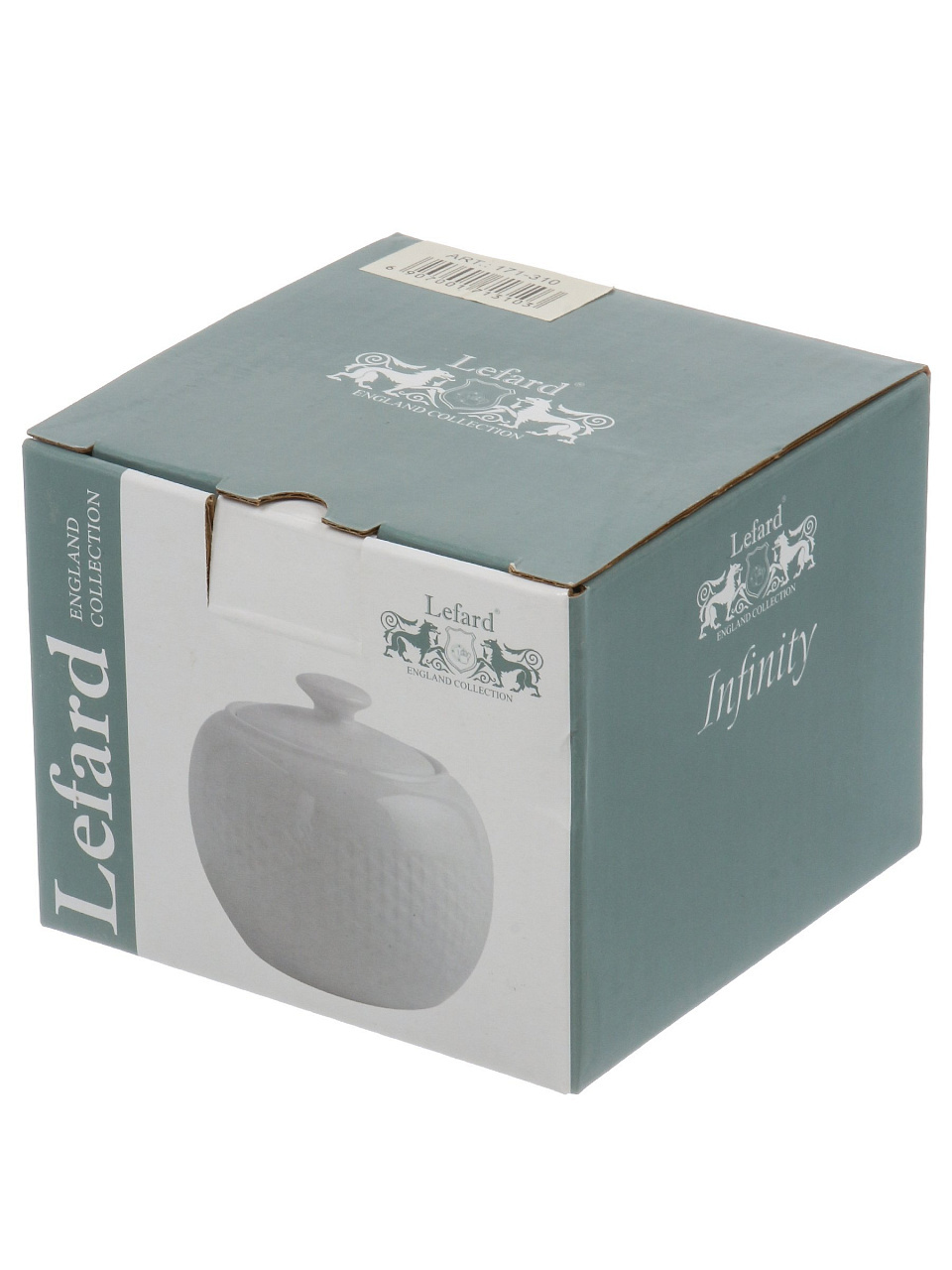 Длина — 11 см, ширина — 11 см, высота — 9 см; материал — белый фарфор, модель Lefard Infinity, артикул 171-310.