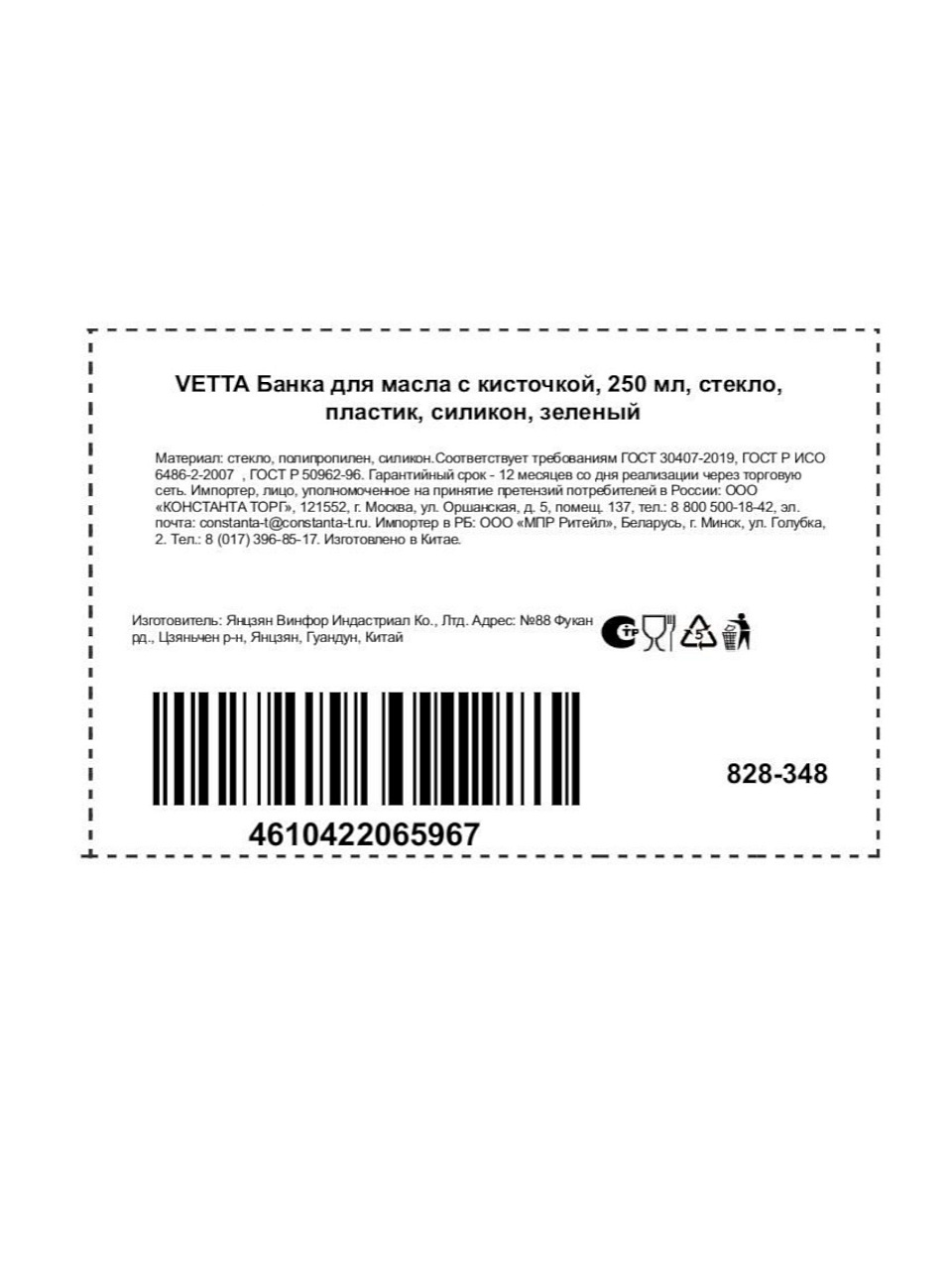 Какой объём у бутылки для масла Vetta 828-348?