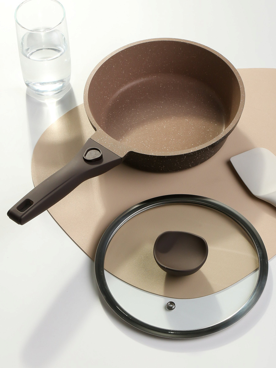 Сковорода Горница Дуэт Шоколадный мусс с литым корпусом из алюминия и гранитным антипригарным покрытием — выбор для тех, кто ищет универсальную посуду для повседневной готовки. Благодаря толщине дна 3 мм и бортикам 59 мм, тепло распределяется равномерно, а блюда сохраняют сочность. Съемная ручка облегчает хранение и мытье — можно использовать в духовке, а затем быстро освободить место на кухне.