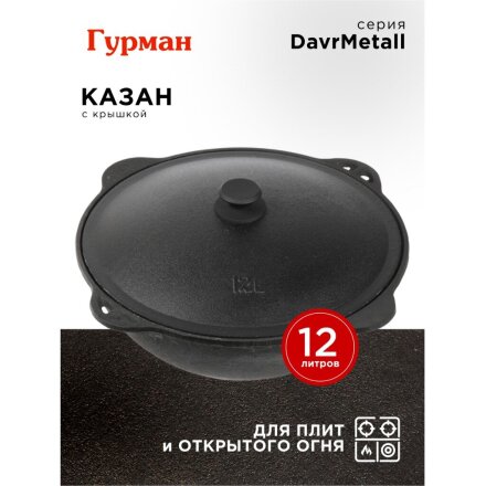 Казан узбекский чугун, 12 л, DavrMetall, с крышкой, крышка алюминий, плоское дно, Гурман